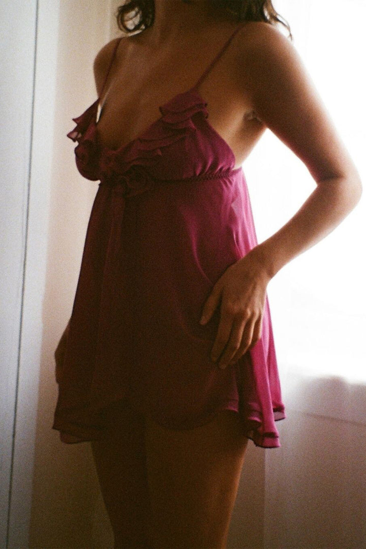 The Rya Collection Charleston Babydoll Set in Berry brings a sense of playfulness to your evening ritual. Light chiffon drifts around the body with a soft, ethereal sway, while the ruffled neckline and fabric rosette add a touch of flirtation that feels beautifully effortless. The overlapping skirt offers just enough coverage to tease, revealing a glimpse of the matching chiffon panty beneath. Feminine, airy and full of charm, this is a piece for moments when you want to feel unforgettable.